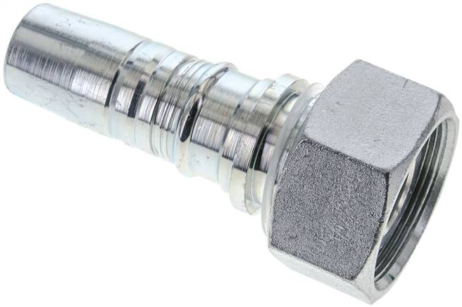 These crimped fittings with tear-off protection are developed specially for the 4 SH-hose. The 4 SH-hose should be skived not only externally but also internally. When compressing, a "metallic bond" is created between the fitting and the hose and this exposes the hose equipped with fittings to the maximum pressure load. The advantage of this combination is, amongst others, the use of a flexible 4-spiral hose or a 4-SH hose instead of a "rigid" 6-spiral hose.