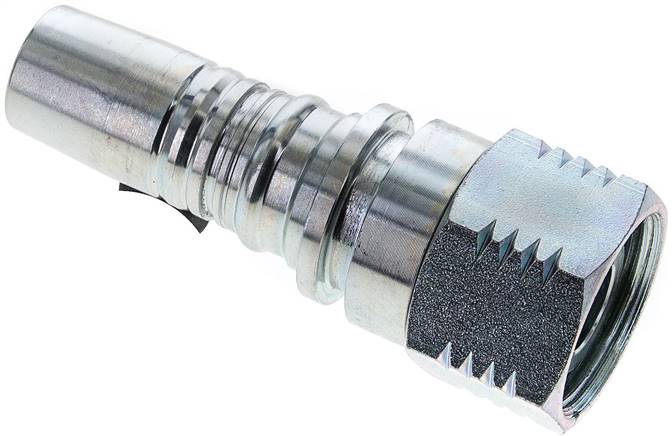 These crimped fittings with tear-off protection are developed specially for the 4 SH-hose. The 4 SH-hose should be skived not only externally but also internally. When compressing, a "metallic bond" is created between the fitting and the hose and this exposes the hose equipped with fittings to the maximum pressure load. The advantage of this combination is, amongst others, the use of a flexible 4-spiral hose or a 4-SH hose instead of a "rigid" 6-spiral hose.