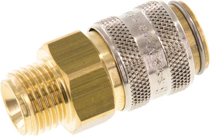 Anschluss, Ventil, Ventilkörper und Entriegelungshülse: Messing oder 1.4305, Feder, Sprengring und Verriegelungskugeln: Edelstahl, Dichtungen: FKM (PTFE-beschichtet)