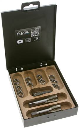 For repairing defective internal threads or for thread reinforcement for materials with low shear strength. A correspondingly larger internal thread must be made to insert a coil, into which the corresponding coil is then inserted. The tap is enclosed.