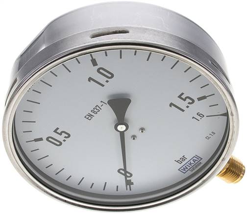 Housing: 1.4301, Measuring system: Cu-alloy (1.4404 for pressures >= 100 bar), connection: Brass, window: instrument plate glass
