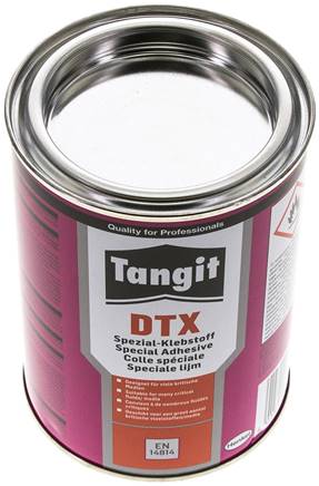 Tangit DTX Spezialklebstoff für kritische Medien wie Schwefelsäure (<93%), Salzsäure (<37%), Salpetersäure (<55%), Natriumhypochlorit (<15%), Wasserstoffperoxid (<70%), Flusssäure (<40%). Offenzeit ca. 1 Minute, Endfesigkeit nach 48 Stunden.