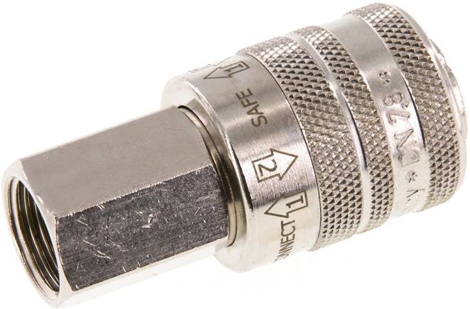 The coupling occurs as for standard couplings, by inserting the push in nipple into the coupling socket. Uncoupling occurs in two steps: By pushing back the unlocking sleeve, the coupling socket closes and ventilates the coupling plug while this is still held in the coupling socket. The plug is then released by pulling the unlocking sleeve. The dangerous recoil effect is thus prevented.