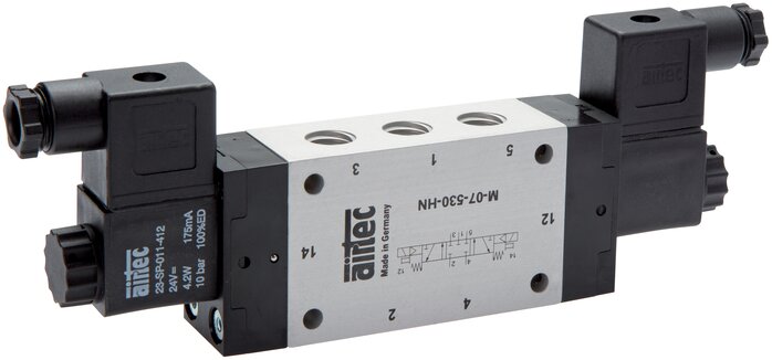 Exemplaire exposé: Électrovanne 5/3 voies Symbole de commutation: Électrovanne 5/3 voies (position médiane fermée) Symbole de commutation: Électrovanne 5/3 voies (position médiane désaérée) Symbole de commutation: Électrovanne 5/3 voies (position médiane ventilée)