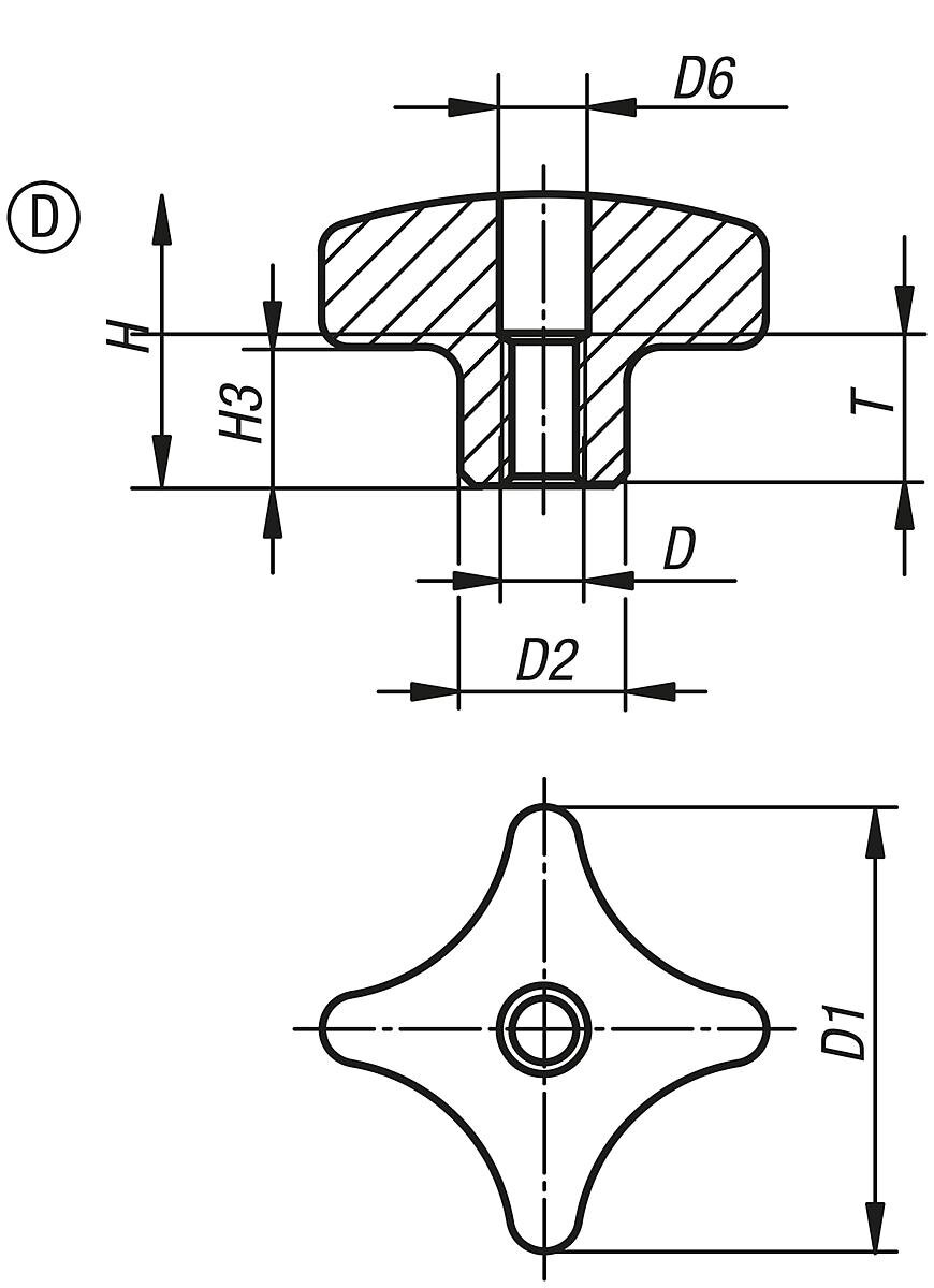 Kreuzgriffe ähnlich DIN 6335 Edelstahl, Form D, Gewinde aufgebohrt, inch